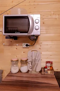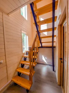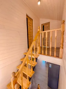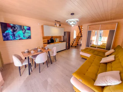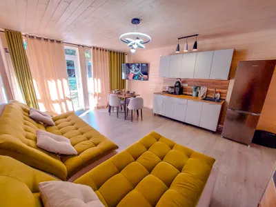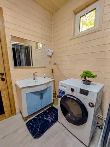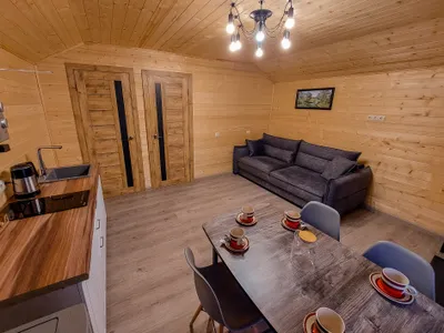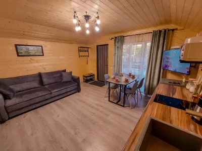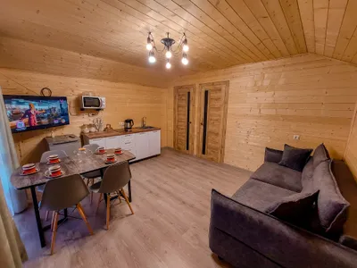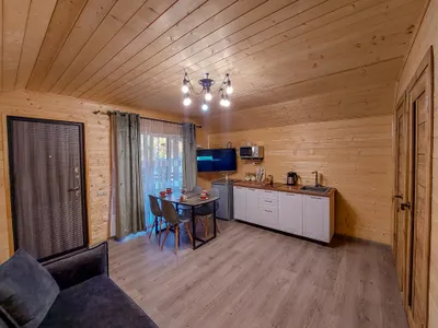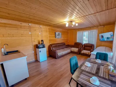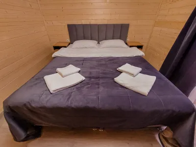 Все было чудесно, отдыхали в конце сентября, на улице днем +15 в домике тепло (теплый пол) Сам домик достаточно большой - отдельная спальня, санузел широкий, большой водонагреватель (нет проблем с горячей водой на всех) вчетвером было очень комфортно. На кухне есть вся необходимая посуда (даже турка сварить кофе, а на местной воде он замечательно вкусный получается). В ванной были все наборы гигиенические, фен. Рядом с домиком мангал, столик-стулья. Можно взять решетку/шампура(у нас свои были), купить дрова. По расположению: на первом фото можно увидеть машины на стоянке, за забором дорога -мы ее не слышали и отдыхать она нам не мешала. Проезжали по городу и во многих базах отдыха и ближе эта самая дорога и домики вплотную, вообще нет уединения. На втором фото из окна спальни вид на лес) С удовольствием вернемся снова!